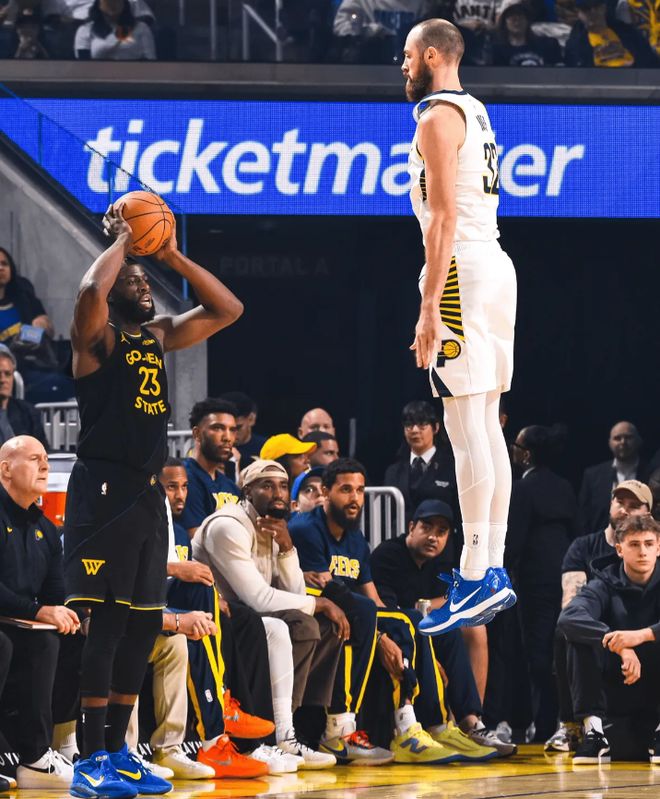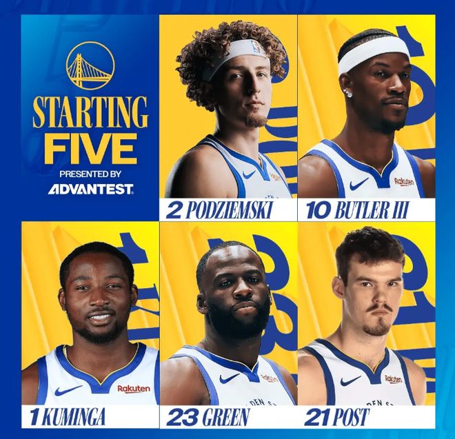 今天比赛,首发阵容方面,勇士队这边,库里继续缺阵,科尔排出的最新首发五人组为:波杰姆斯基、乔纳森-库明加、吉米-巴特勒、昆滕-波斯特、德雷蒙德-格林;步行者这边,首发阵容则为:安德鲁-内姆布哈德、本-谢泼德、贾雷斯-沃克、杰-胡夫、以赛亚-杰克逊。